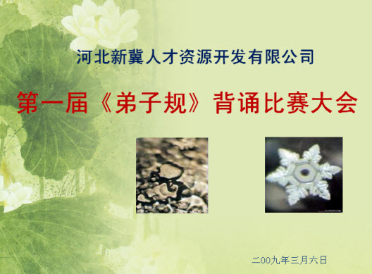 3月6日,河北新冀人才資源開發(fā)有限公司舉辦了第一屆《弟子規(guī)》背誦比賽大會(huì),并取得了圓滿成功。本次比賽活動(dòng)由新冀公司發(fā)起,以學(xué)《弟子規(guī)》為主要內(nèi)容,行《弟子規(guī)》為目的,并最終實(shí)現(xiàn)將《弟子規(guī)》精神作為公司文化核心。